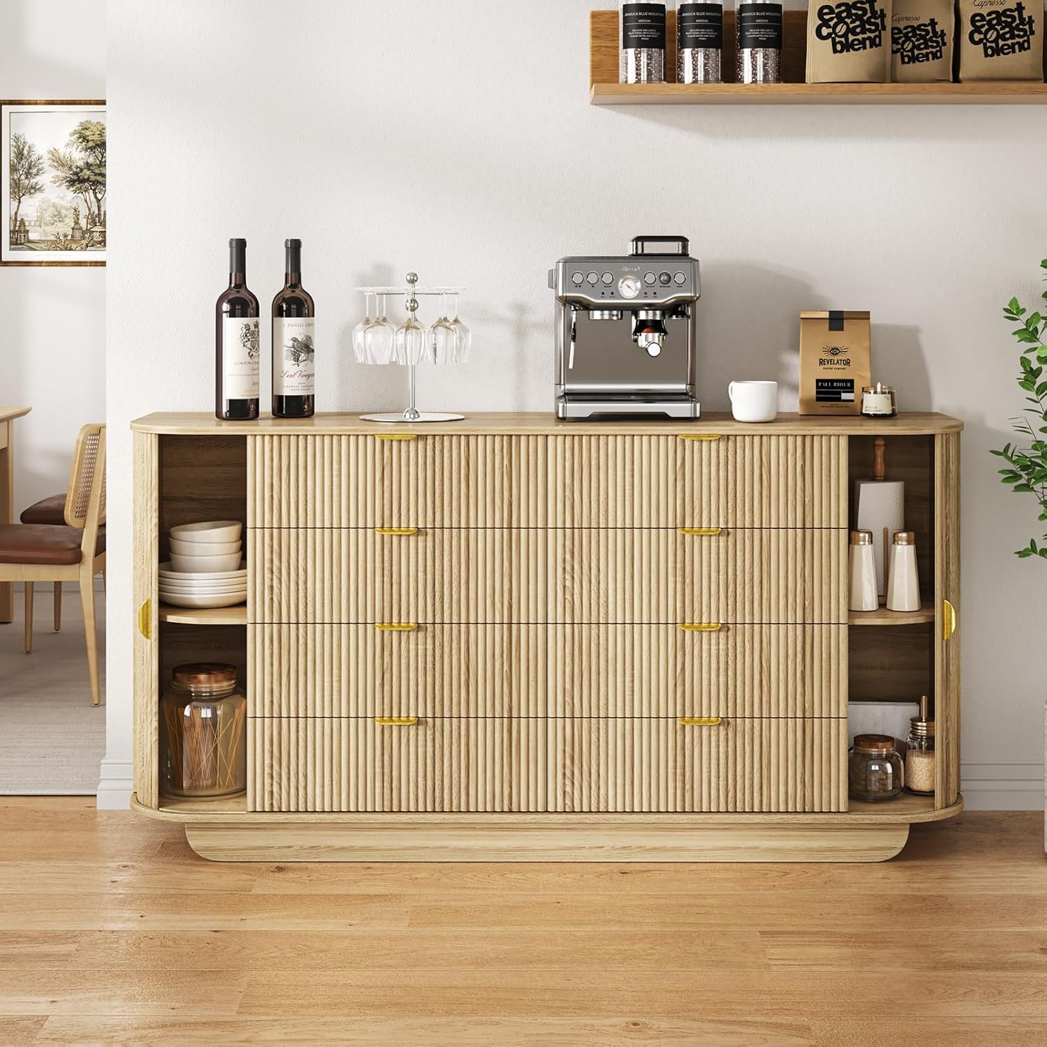 Introducing the 63″ Tambour Dresser for Bedroom, a stunning blend of modern design and functional storage. This elegant chest of drawers features 8 spacious drawers, perfect for organizing your clothing, accessories, and more. The unique sliding doors reveal 4 additional shelves, providing versatile storage options for your bedroom, closet, or living room.