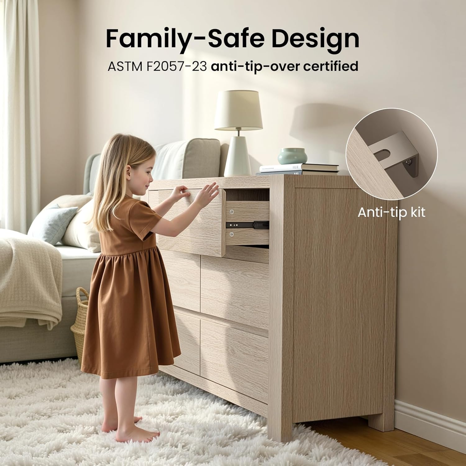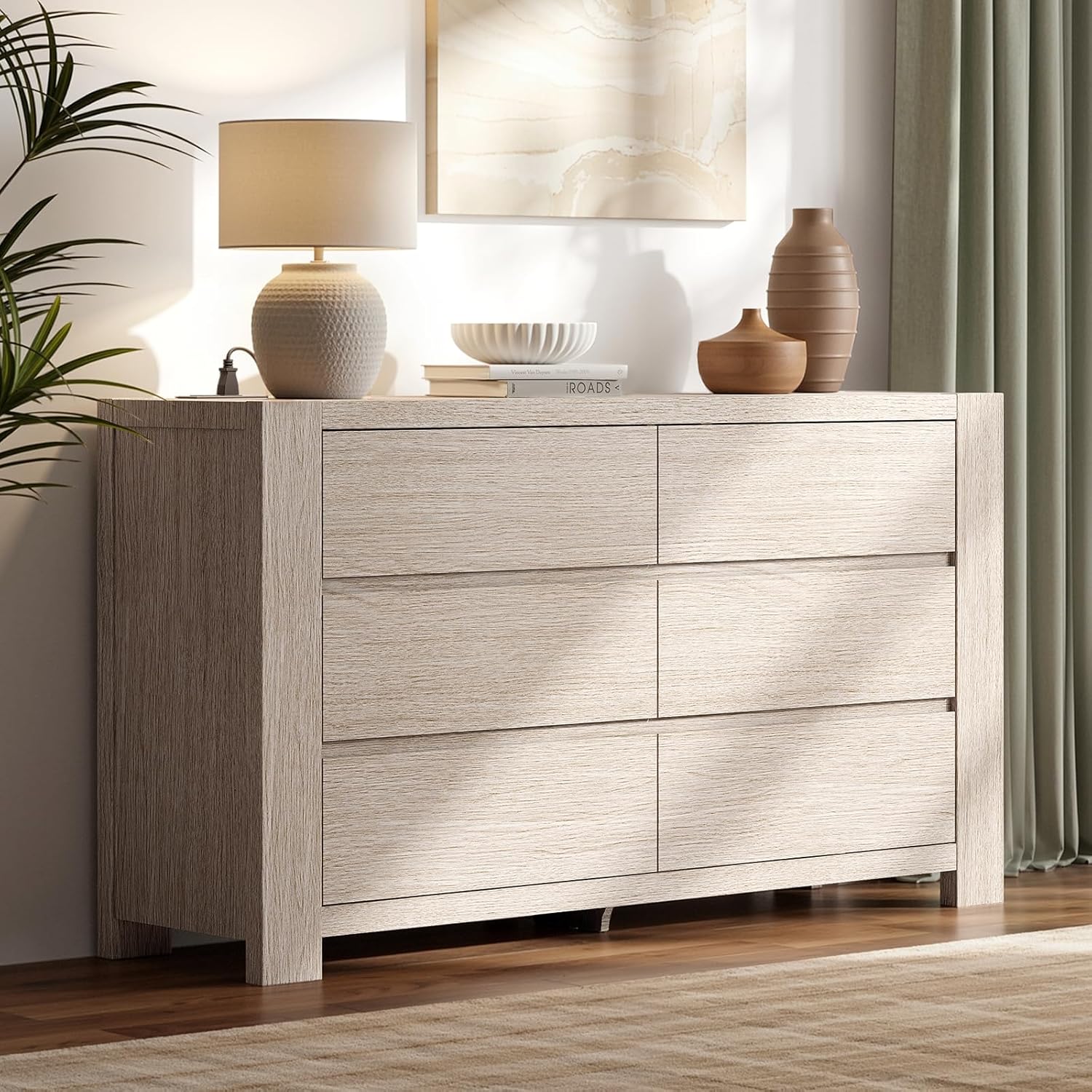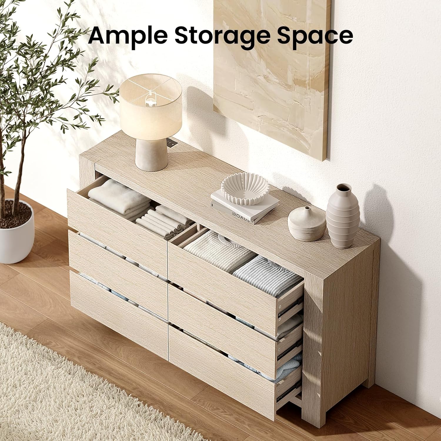 Introducing the ModernMate 6 Drawer Dresser, a perfect blend of style and functionality for your bedroom or living space. This 55” modern white oak chest of drawers features a sleek design that complements any decor while providing ample storage. With six spacious drawers, you can easily organize clothing, accessories, or nursery essentials, keeping your space tidy and clutter-free.
